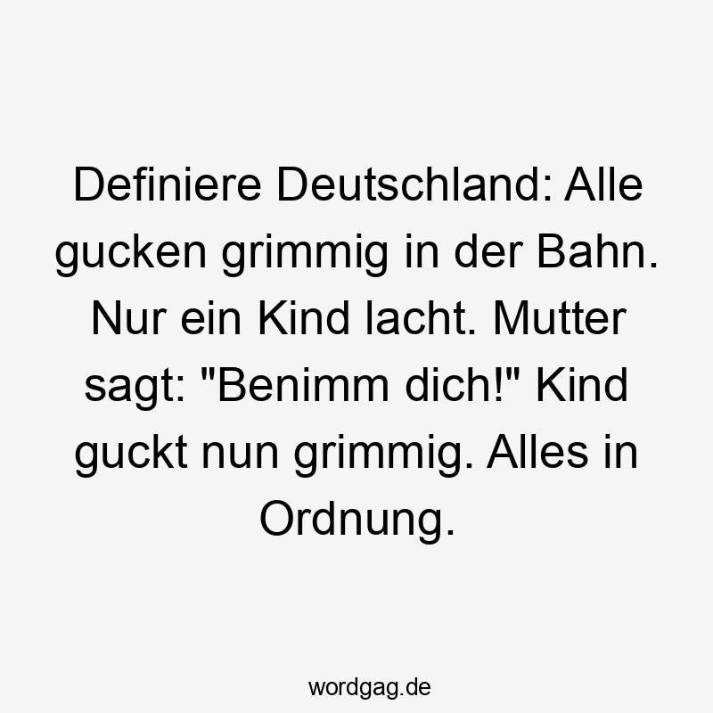 Definiere Deutschland: Alle gucken grimmig in der Bahn. Nur ein Kind lacht. Mutter sagt: „Benimm dich!“ Kind guckt nun grimmig. Alles in Ordnung.