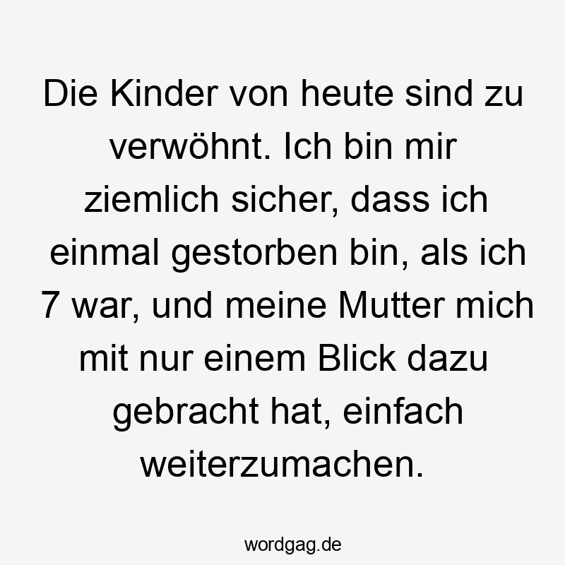 Die Kinder von heute sind zu verwöhnt. Ich bin mir ziemlich sicher, dass ich einmal gestorben bin, als ich 7 war, und meine Mutter mich mit nur einem Blick dazu gebracht hat, einfach weiterzumachen.