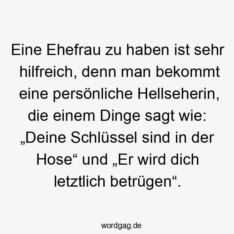 Eine Ehefrau zu haben ist sehr hilfreich, denn man bekommt eine persönliche Hellseherin, die einem Dinge sagt wie: „Deine Schlüssel sind in der Hose“ und „Er wird dich letztlich betrügen“.