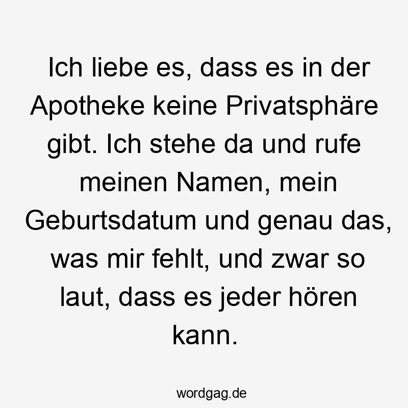 Ich liebe es, dass es in der Apotheke keine Privatsphäre gibt. Ich stehe da und rufe meinen Namen, mein Geburtsdatum und genau das, was mir fehlt, und zwar so laut, dass es jeder hören kann.