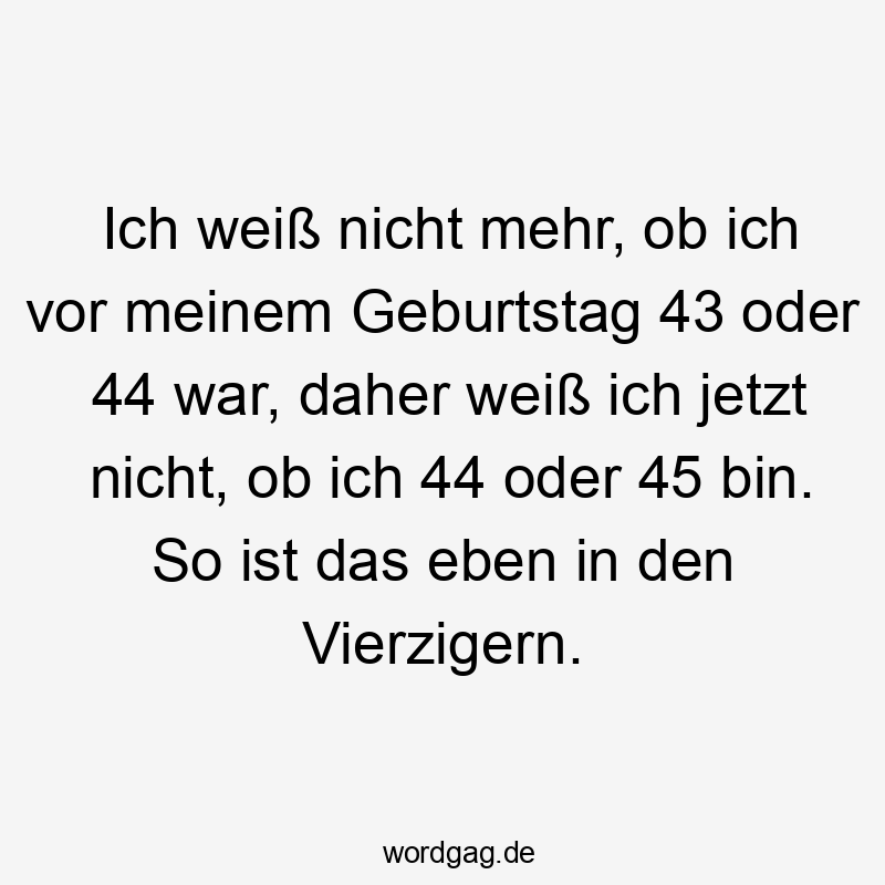 Ich weiß nicht mehr, ob ich vor meinem Geburtstag 43 oder 44 war, daher weiß ich jetzt nicht, ob ich 44 oder 45 bin. So ist das eben in den Vierzigern.