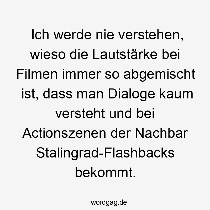 Der Spruch spricht ein verbreitetes Problem an, das vor allem beim Anschauen von Filmen zuhause oder im Kino auftreten kann. Oft sind die Dialoge zu leise eingestellt, während die Actionszenen extrem laut und mit vielen Effekten versehen sind. Dies kann dazu führen, dass man die Dialoge nicht richtig versteht und dann von den lauten Szenen regelrecht überwältigt wird.