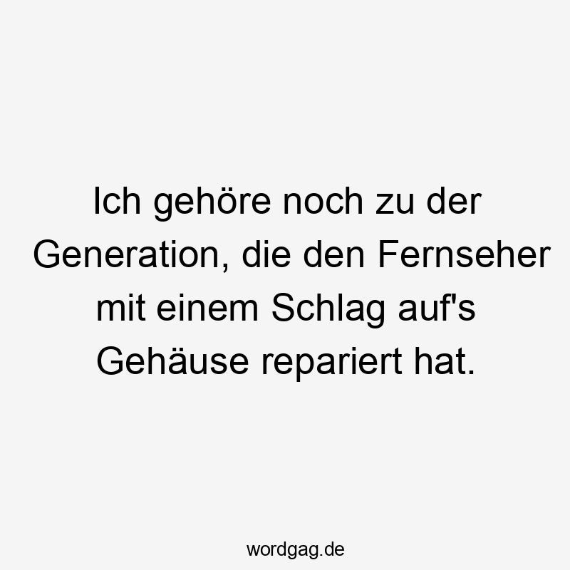 Dieser lustige Spruch spielt auf die Nostalgie und technischen Veränderungen in Bezug auf Fernsehgeräte an. Die Aussage „Ich gehöre noch zu der Generation, die den Fernseher mit einem Schlag aufs Gehäuse repariert hat.“ verweist darauf, wie in früheren Zeiten Fernseher oft technische Probleme hatten, die mit simplen, aber unkonventionellen Methoden gelöst wurden.